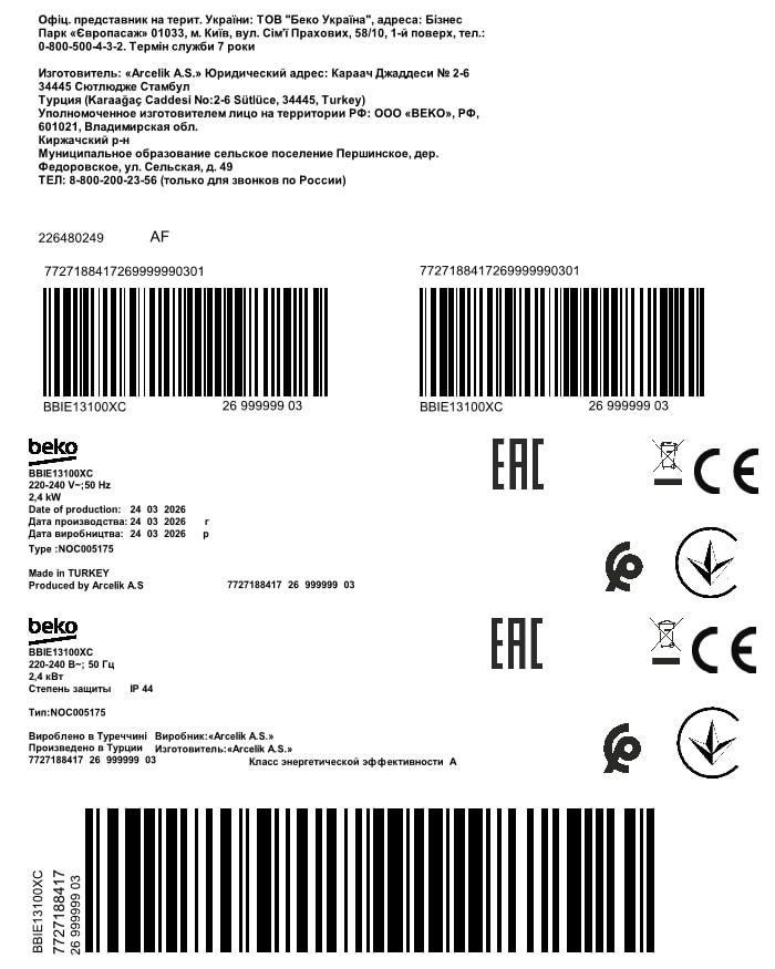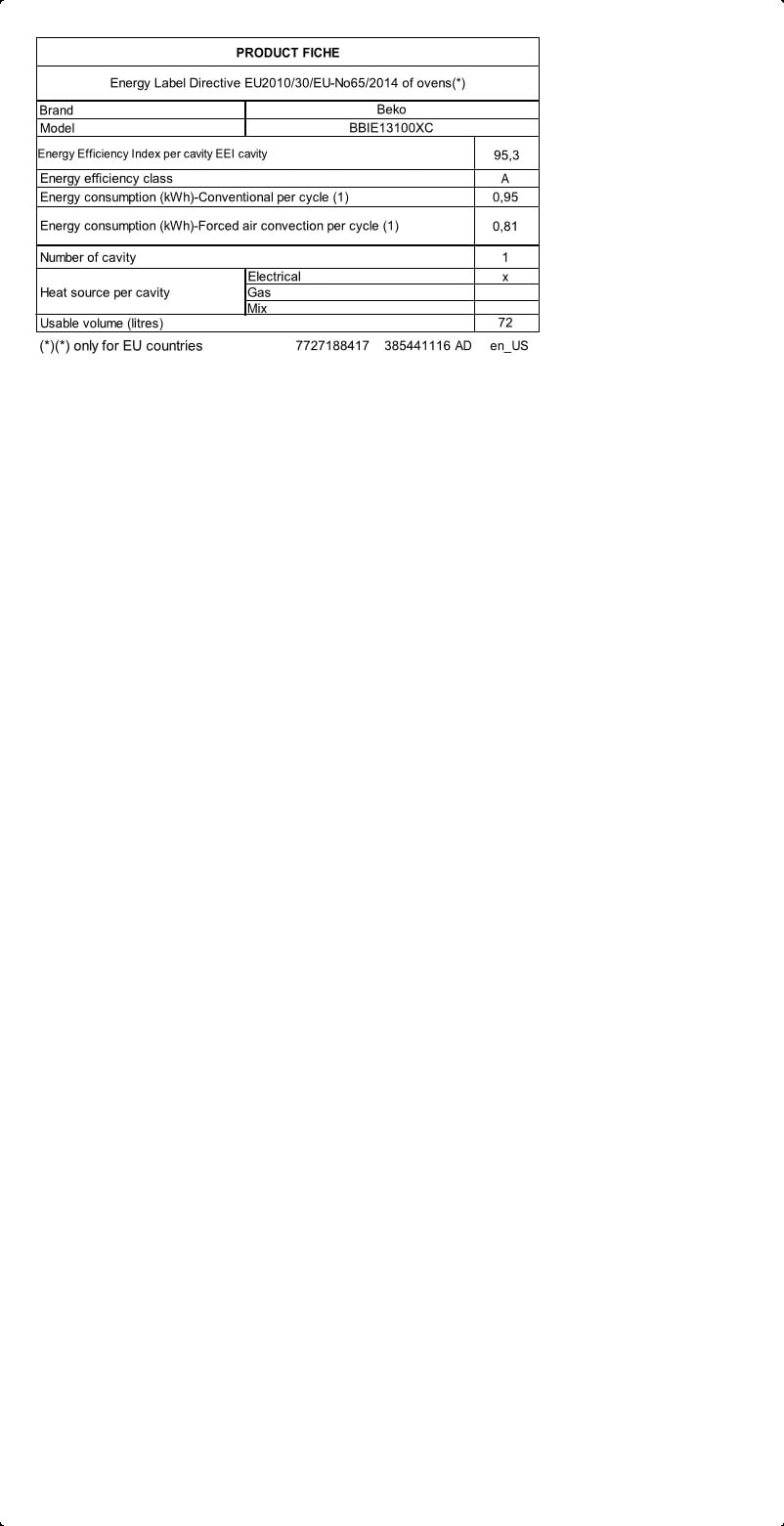 BBIE13100XC: 60 см 72 л Нагревательный элемент Встраиваемый духовой шкаф