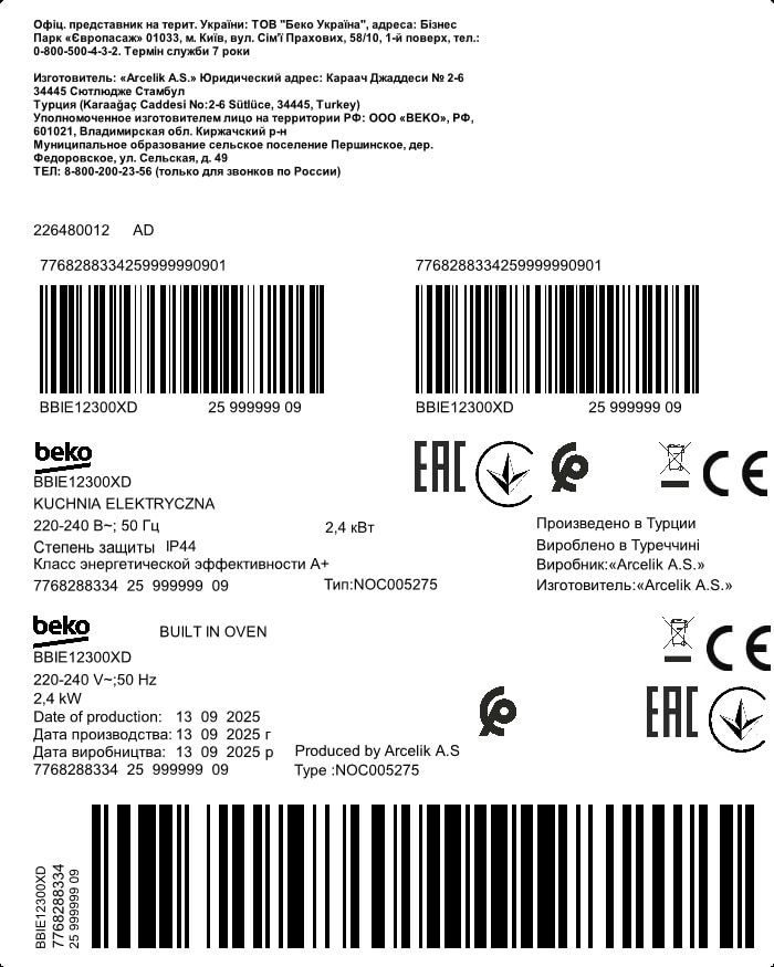 BBIE12300XD: 60 см 72 л Нагревательный элемент Встраиваемый духовой шкаф