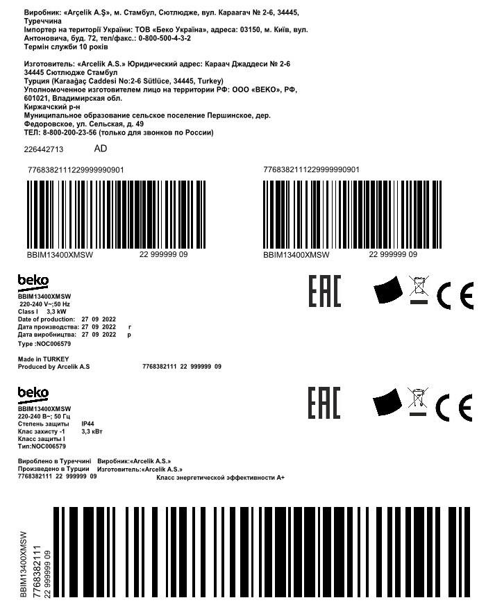 BBIM13400XMSW: Встраиваемый духовой шкаф (60 см 72 л)