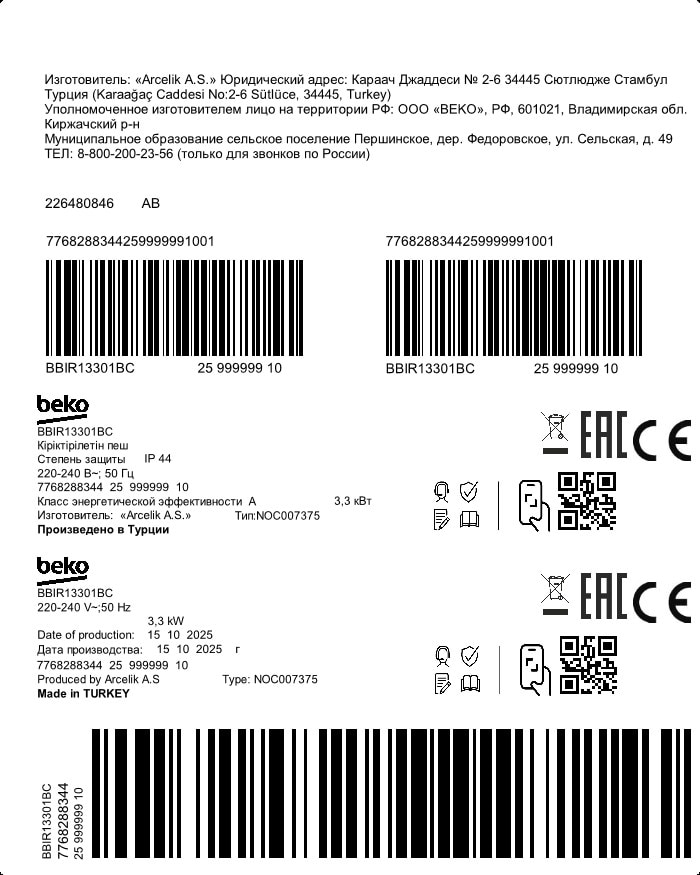 BBIR13301BC: Встраиваемый духовой шкаф (60 см 72 л)