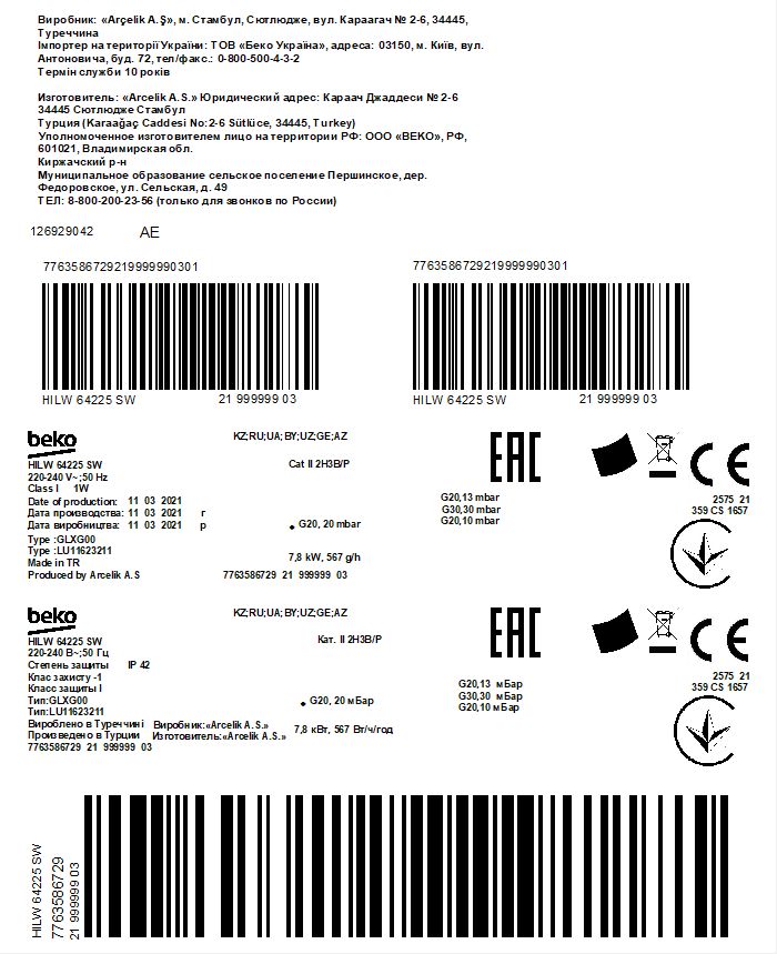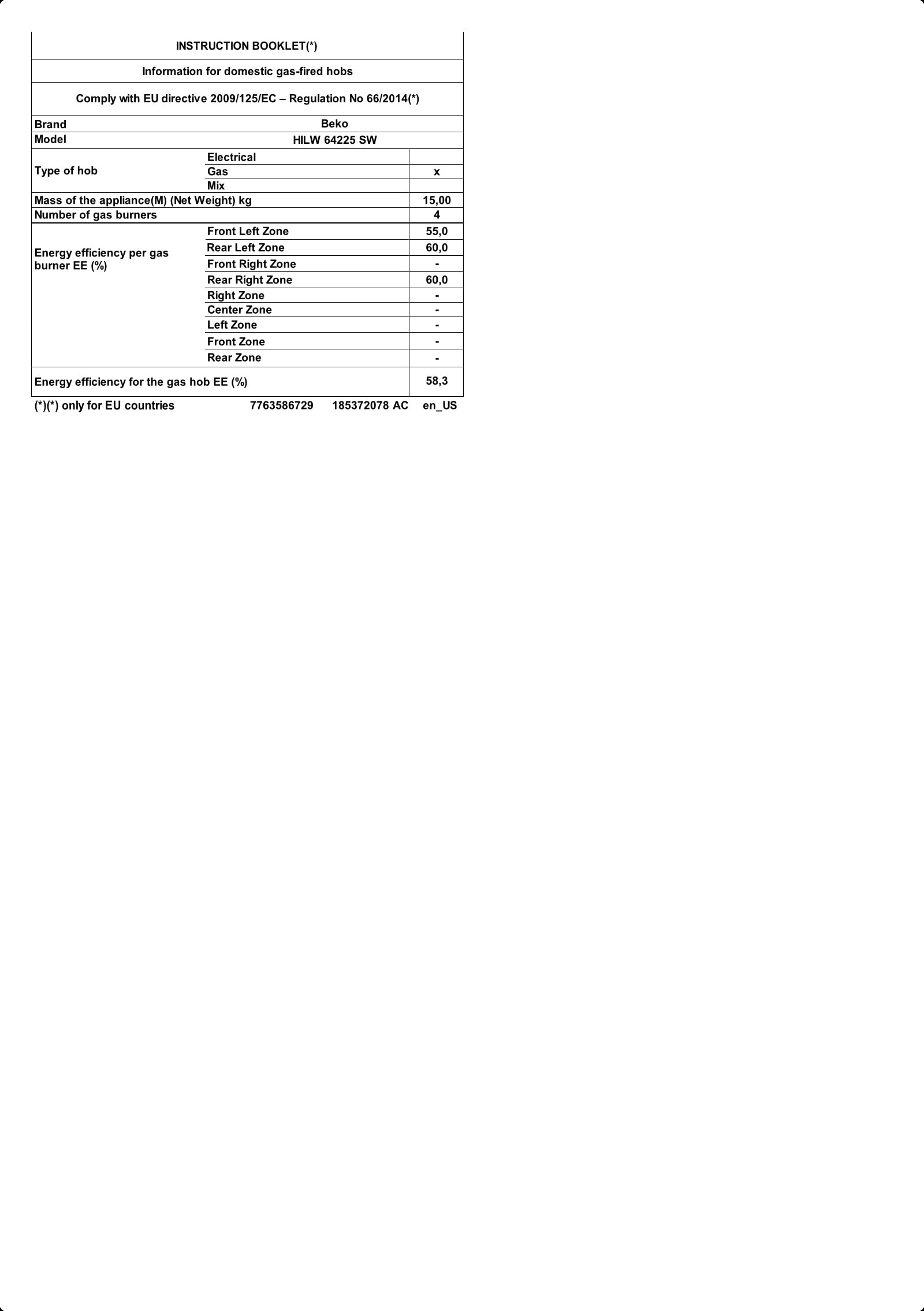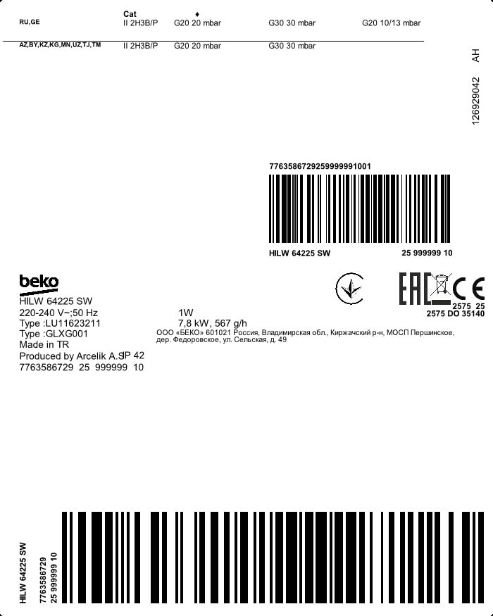 HILW 64225 SW: Газовая варочная поверхность, стекло, 60 см