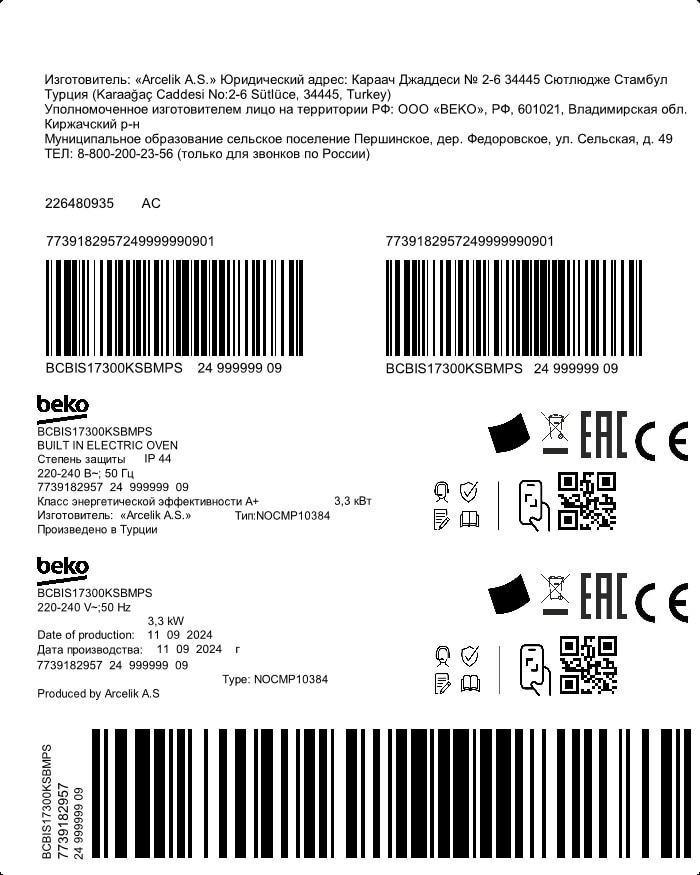 BCBIS17300KSBMPS: Вградена рерна (60 cm, 72 Л)