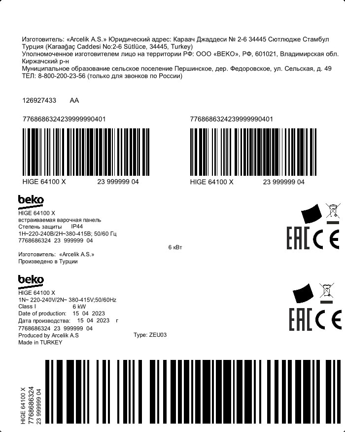 HIGE 64100 X: Вградена плоча за готвење (Електричен, 61)