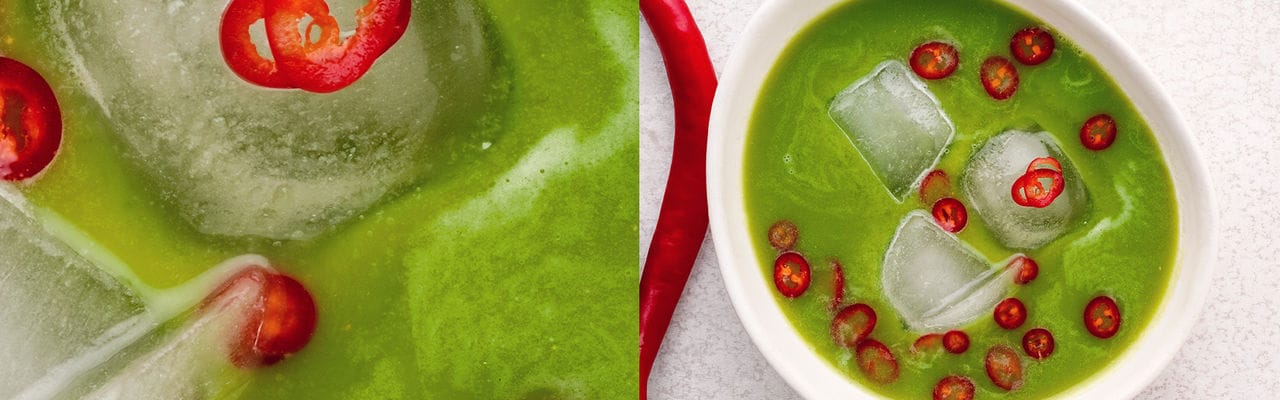 2. To two serving bowl, add ice cubes pour cold soup on top.