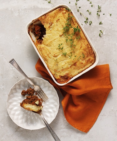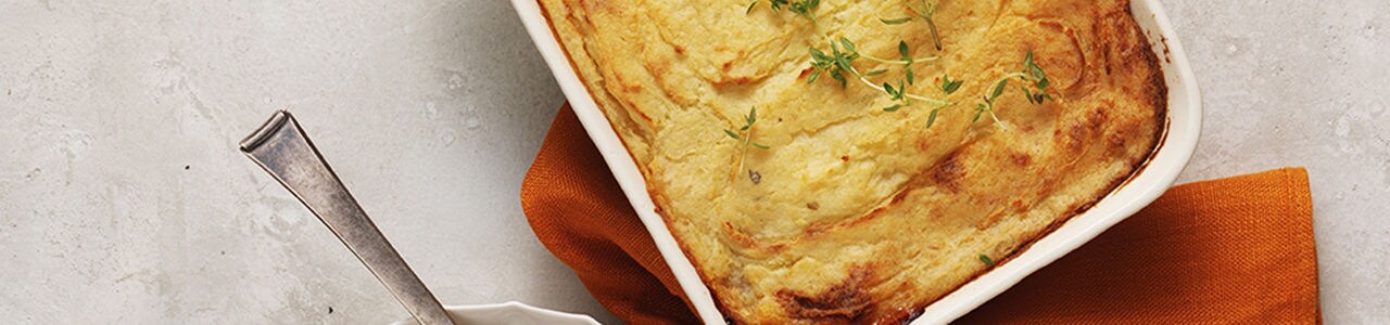 9. Pour the beef mince into a casserole dish, smooth out to the dish's edges and top with the mash.