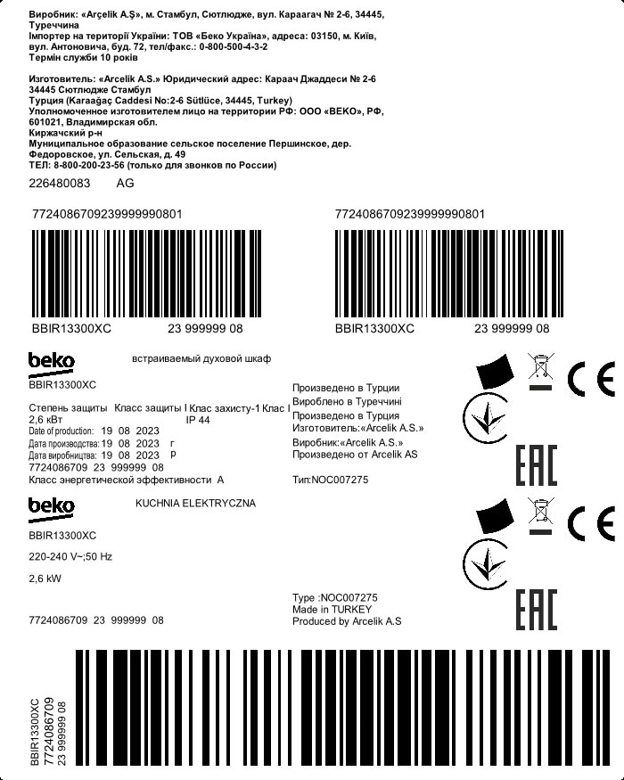 BBIR13300XC: Piekarnik do zabudowy (60 cm 72 L)