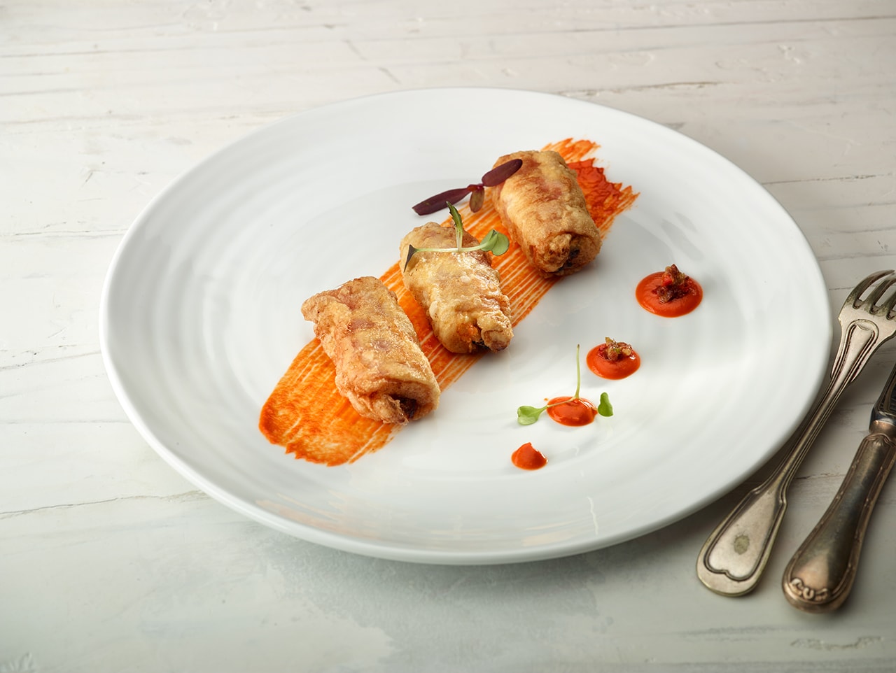 Colocar los espárragos rellenos sobre la salsa y añadir un hilo de aceite por encima.