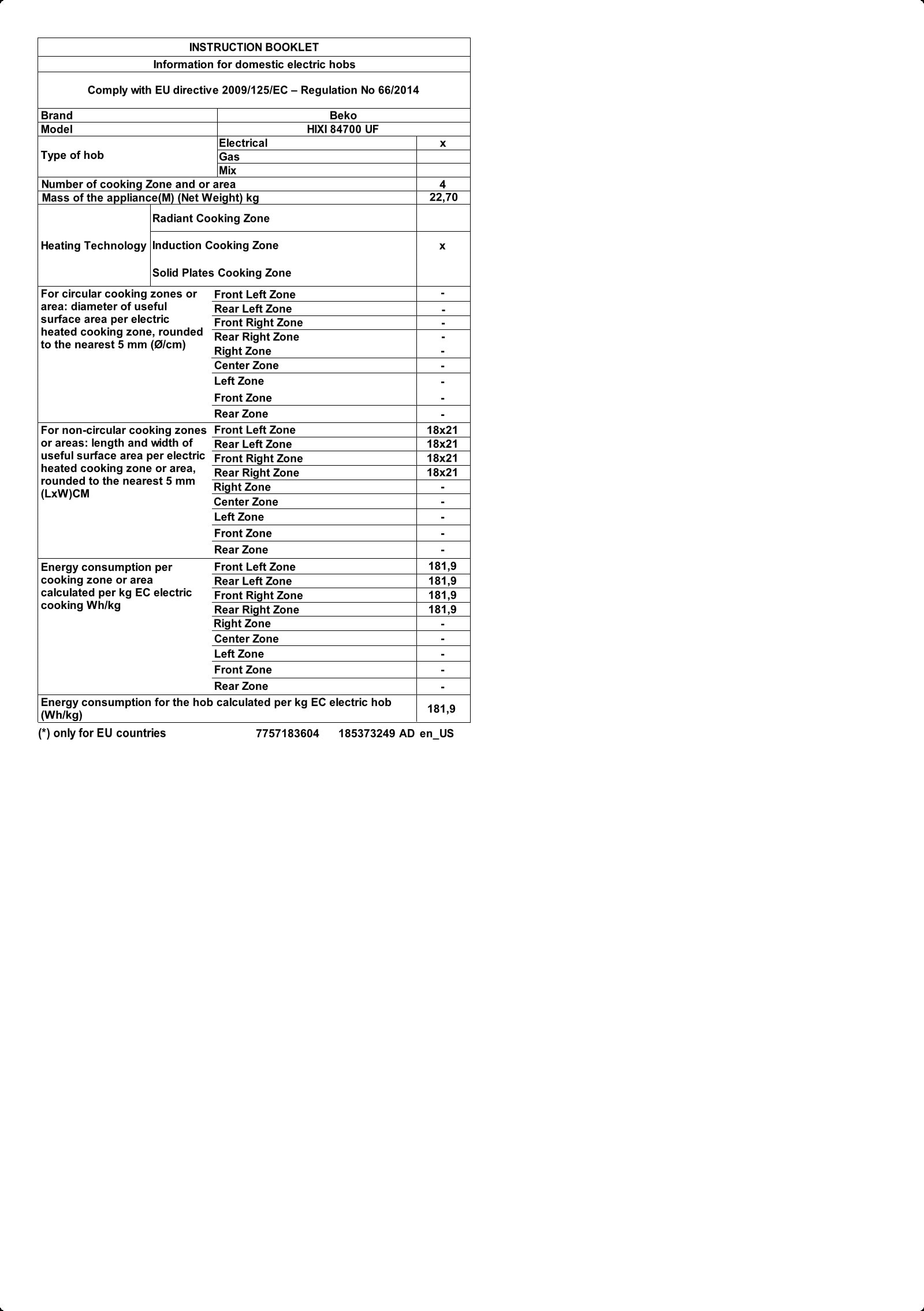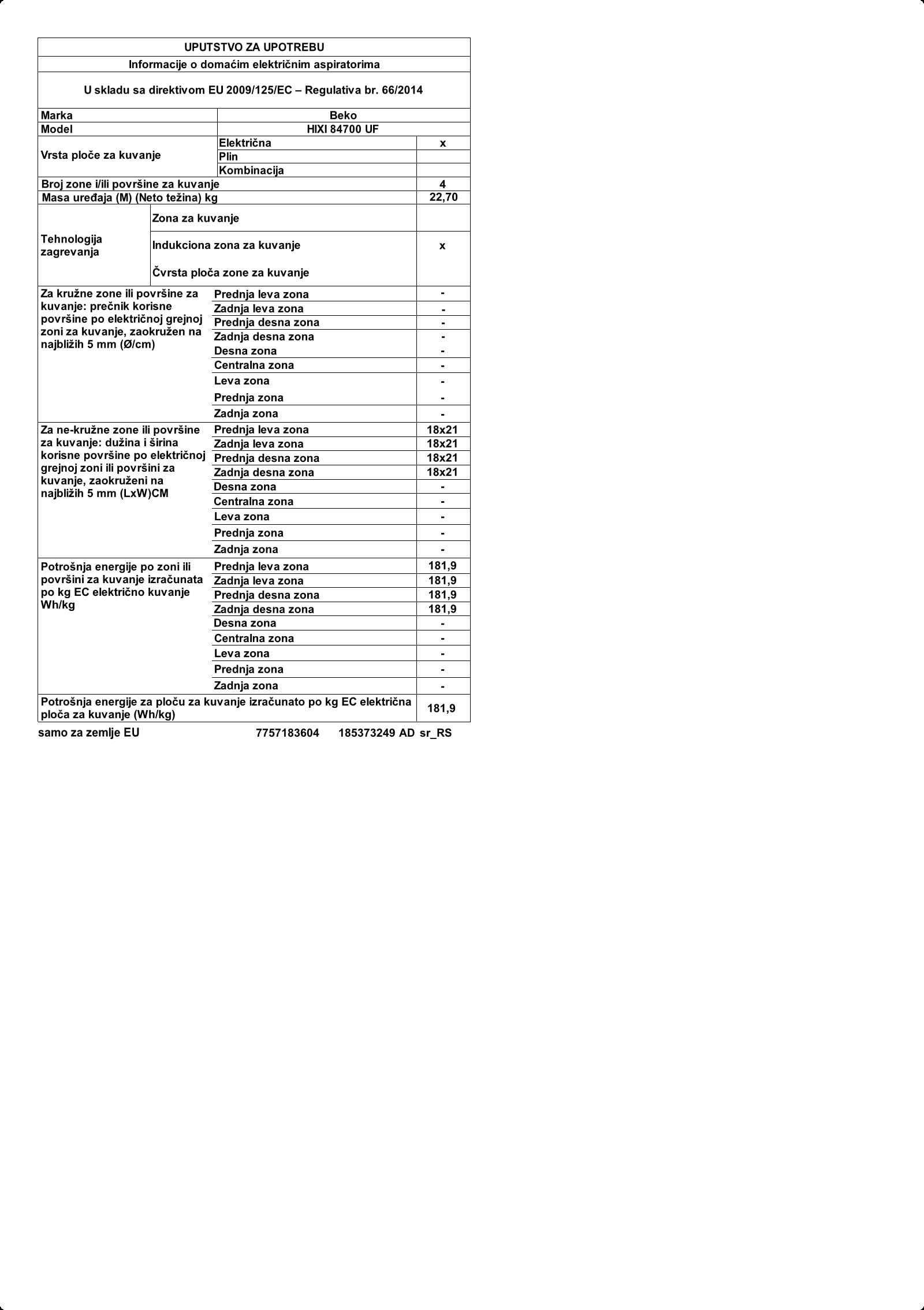 HIXI 84700 UF: Ugradna ploča (Indukciona, 80 cm)