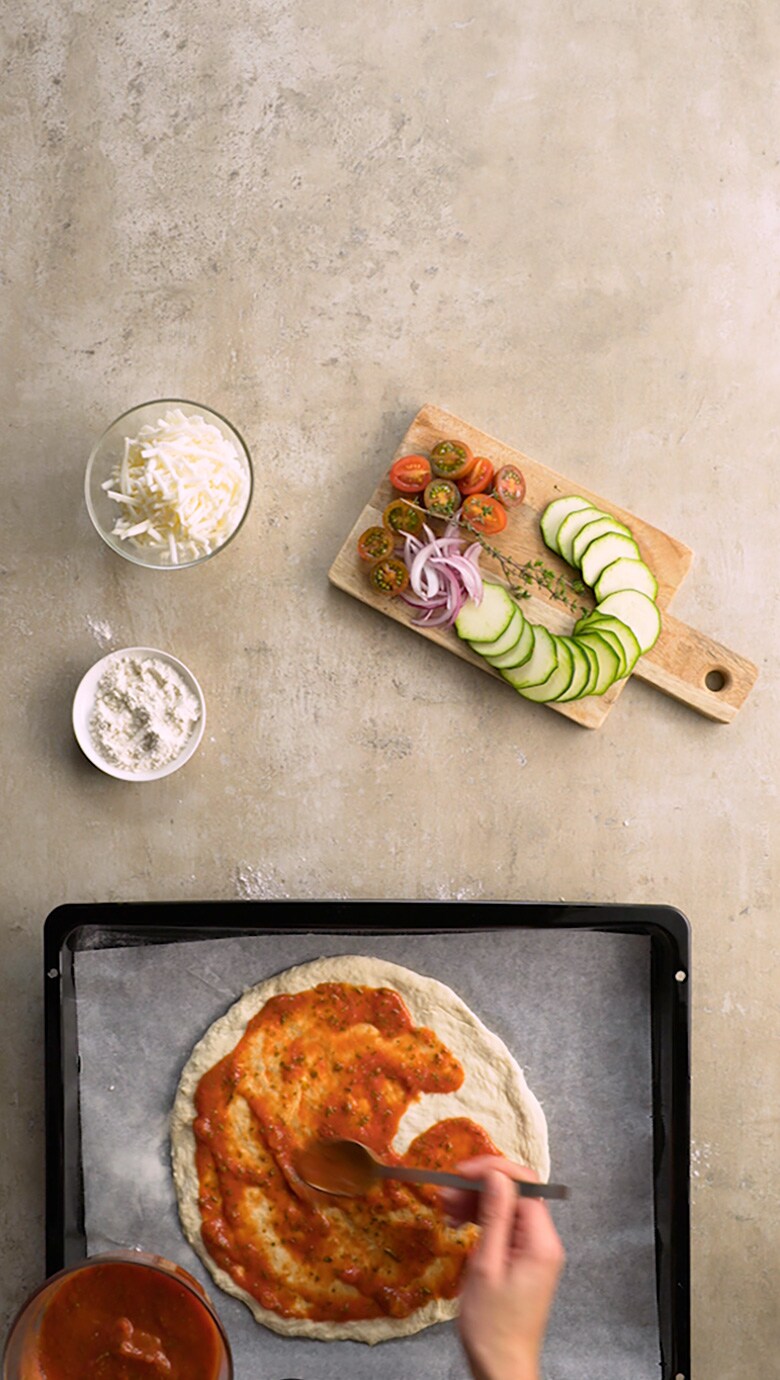 الخطوة 8: اخلطي الطماطم مع المردقوش لتحضير الصلصة. ثم وزعيها على سطح عجينة البيتزا.