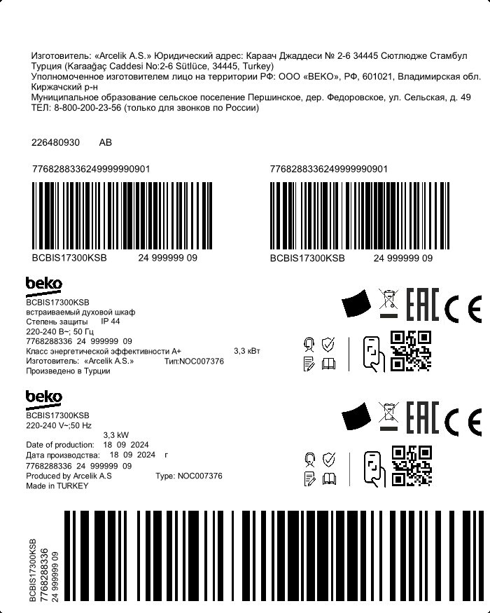 BCBIS17300KSB: Vgradna pečica (60 cm, 72 L)