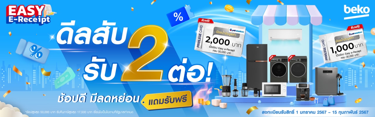ต่อที่ 1: รับสิทธิลดหย่อนภาษีกับโครงการ Easy e-Receipt มูลค่าสูงสุด 50,000 บาท โดยสามารถเลือกซื้อสินค้า Beko ได้ที่จุดจำหน่ายสินค้าในห้างสรรพสินค้าชั้นนำทั่วประเทศ หรือช่องทางออนไลน์ เว็บไซต์ www.beko.com/th-th รวมถึง Official Store บน Shopee และ Lazada ตั้งแต่วันนี้ - 15 กุมภาพันธ์ 2567