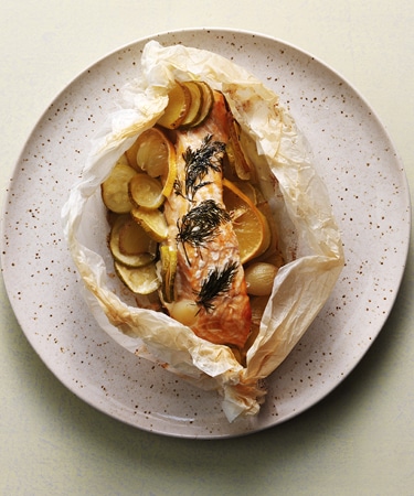 2. Fold a large piece of parchment paper. Lay zucchini and potatoes on the parchment paper, then top with shallot, dill/thyme and lemon slices.
