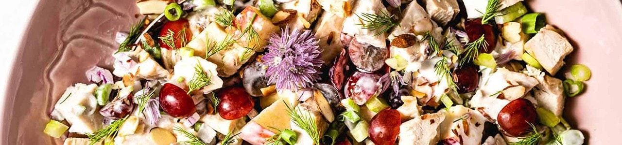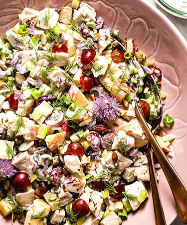 2. To make the salad: Place chicken, scallions, red onion, celery, apples, grapes, and almond into a bowl. If you are adding the