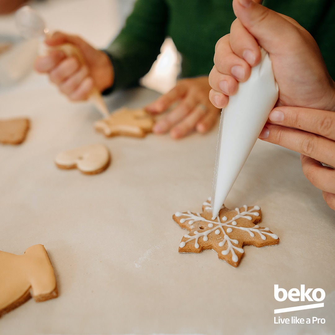 Place the individual cookies on clean baking paper, place the icing into a piping bag to begin piping the icing onto the cookies. Optional: sprinkle with edible silver or gold shimmer.