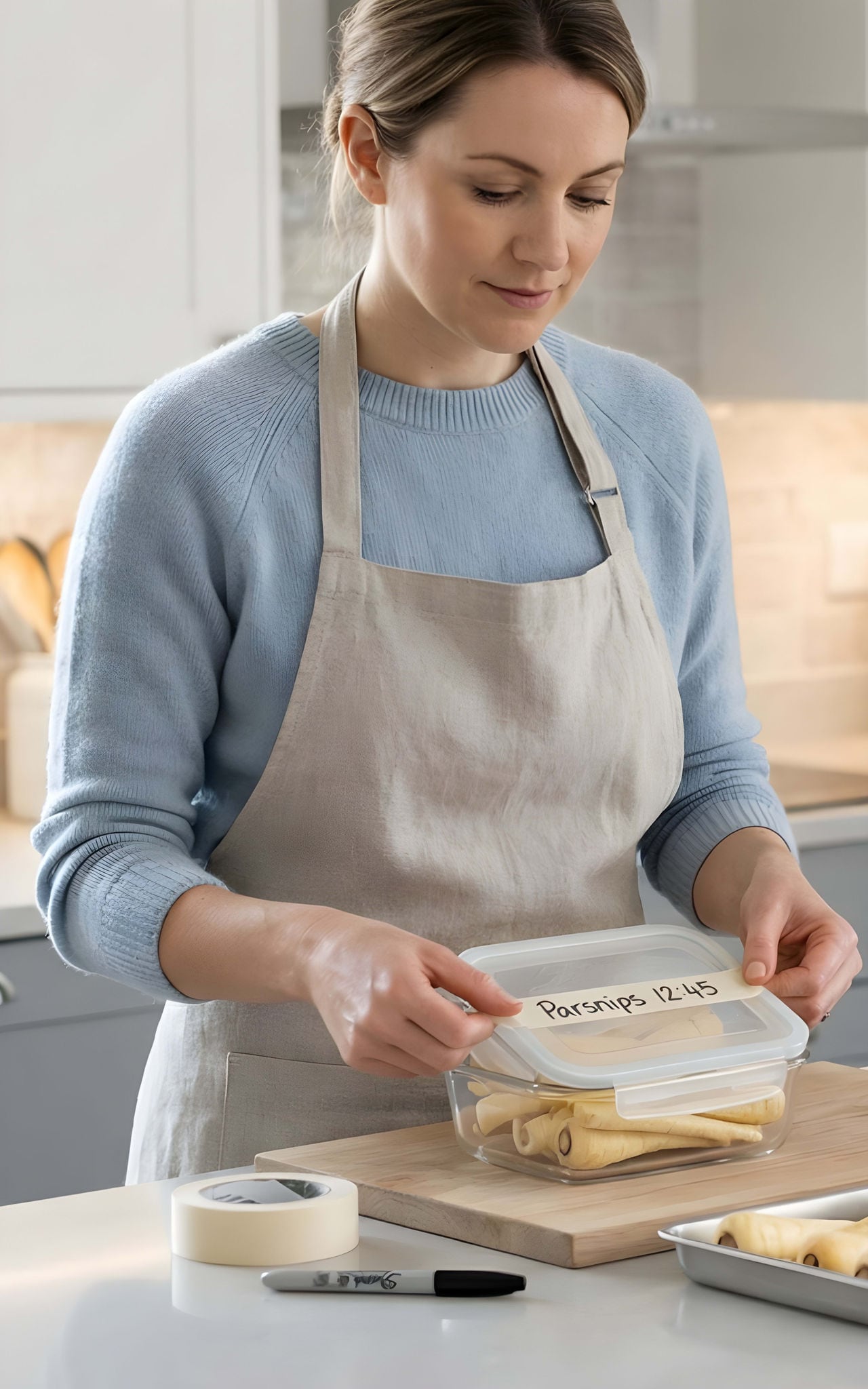 • Clear the fridge and freezer, then assign shelves for meat, veg, desserts, and leftovers.
