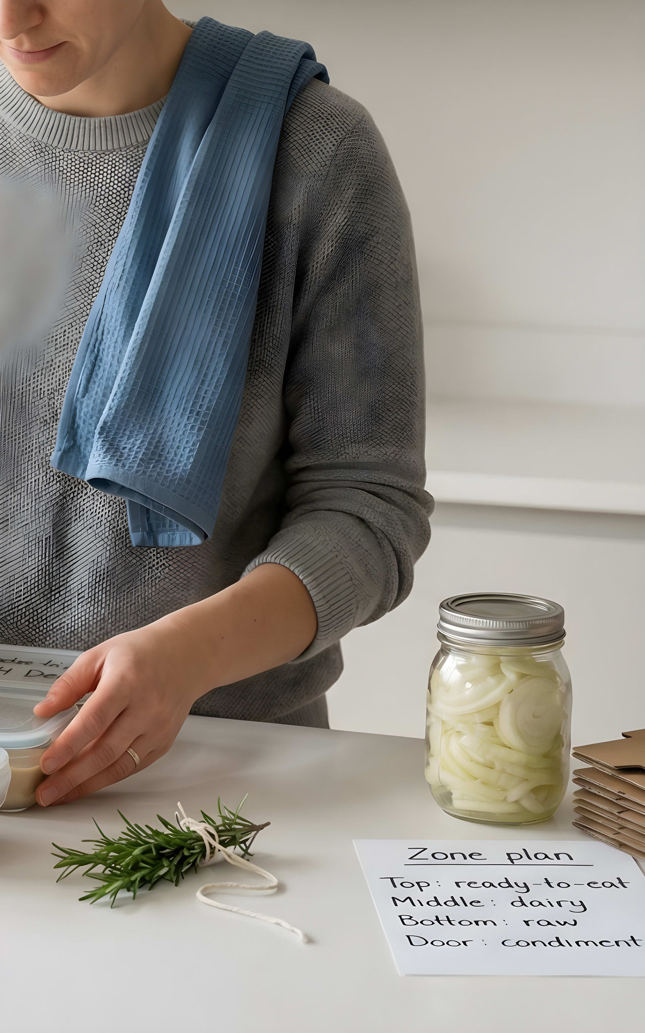 Plan where each item will live before the shop lands. Raw meat on the bottom shelf, to contain drips. Ready-to-eat foods and dairy on upper and middle shelves. Condiments in the door. This reduces rummaging time and helps the cold stay in.