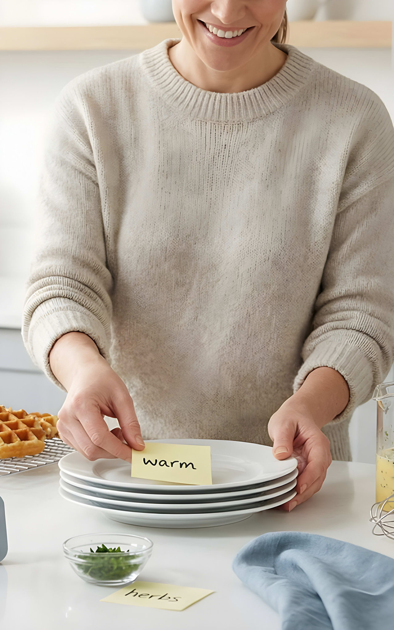 Use a low oven to hold finished items while you plate the next batch. Keep waffles crisp on a wire rack in the oven at a gentle heat. Warm plates for two to three minutes before serving, food stays hot longer so you do not rush plating.