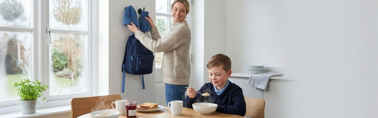 Try a simple flow that steadies the first hour: - Switch on soft lighting, set the heating a little earlier than usual. - Warm mugs and bowls, then prep porridge toppings or toast spreads. - Keep school kit or work layers by the door, gloves and hat on a single hook. - Open blinds soon after waking to signal daytime to the body. - Start laundry or the dishwasher before breakfast, so evenings feel lighter.